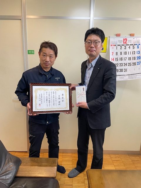 令和7年12月8日に山口社長がお越しになり、手島健さんの永年勤続30年の表彰を行いました。